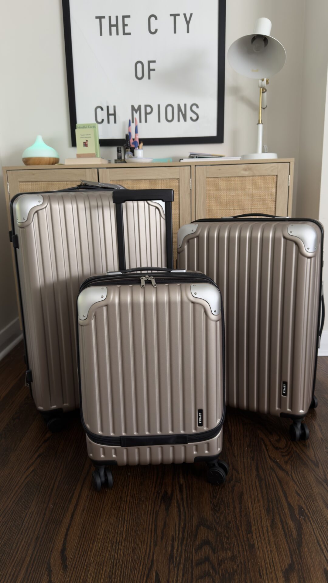 The opted for the 3 piece Grace Luggage Set which comes in a navy, black and champagne. We got the champagne as I love neutrals and thought it looked so classy! As a family, the 3 size variations is really nice. Sometimes we use all 3 for a bigger trip we are doing, sometimes we just use the bigger one where we bring additional backpacks for the plane and sometimes we bring the smaller carry on luggage and the medium one