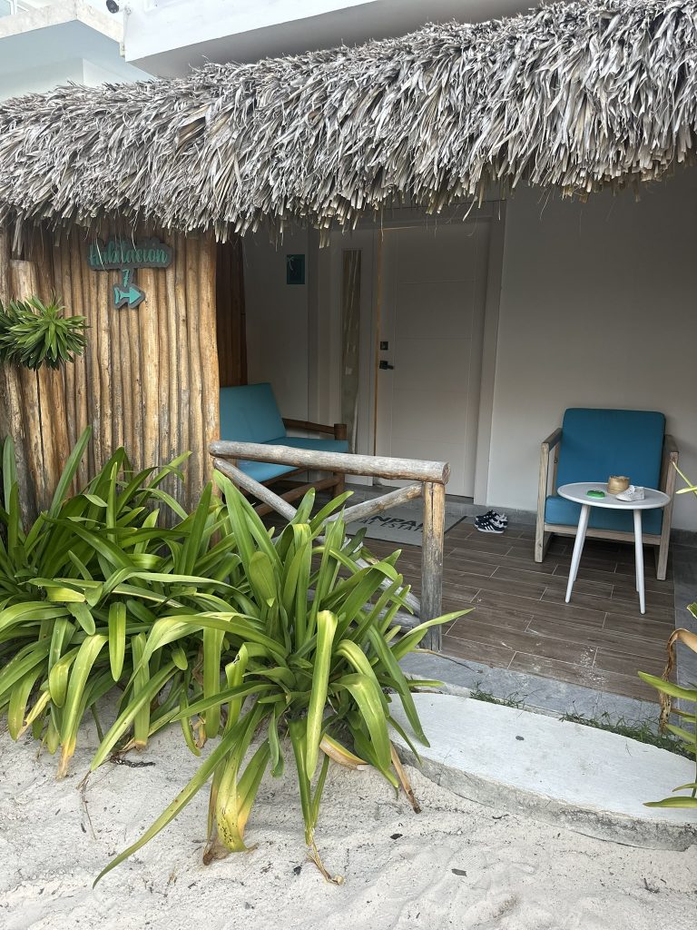 We stayed at this hotel for 3 nights at the beginning of our trip and if you are looking for a no frills spot, this small boutique hotel is perfect. It is a beach front property with just a handful of rooms that each have their own terrace 30 seconds from the ocean. The interior is simple but it has AC/daily cleaning/glassware/a mini fridge and safe. For $250 CAD, you can’t beat the price